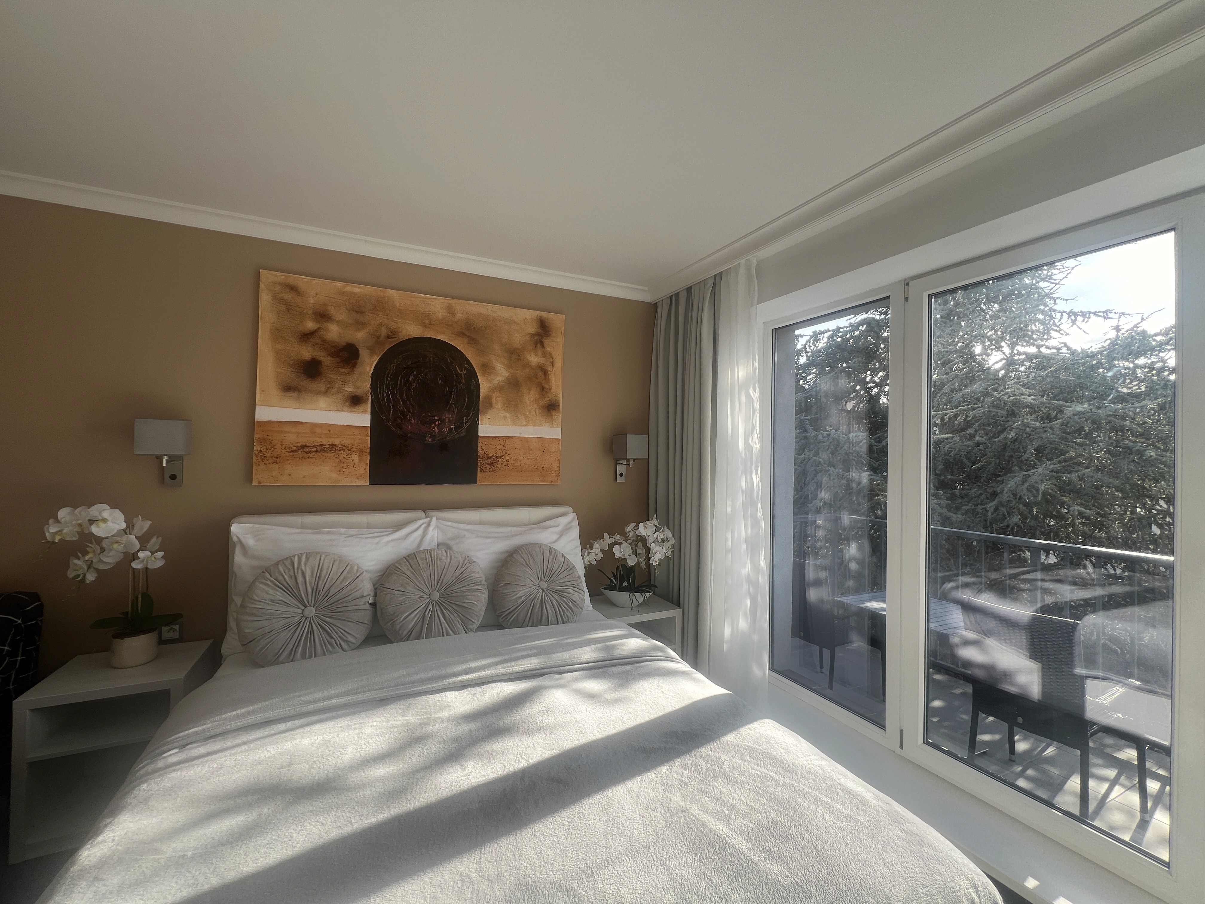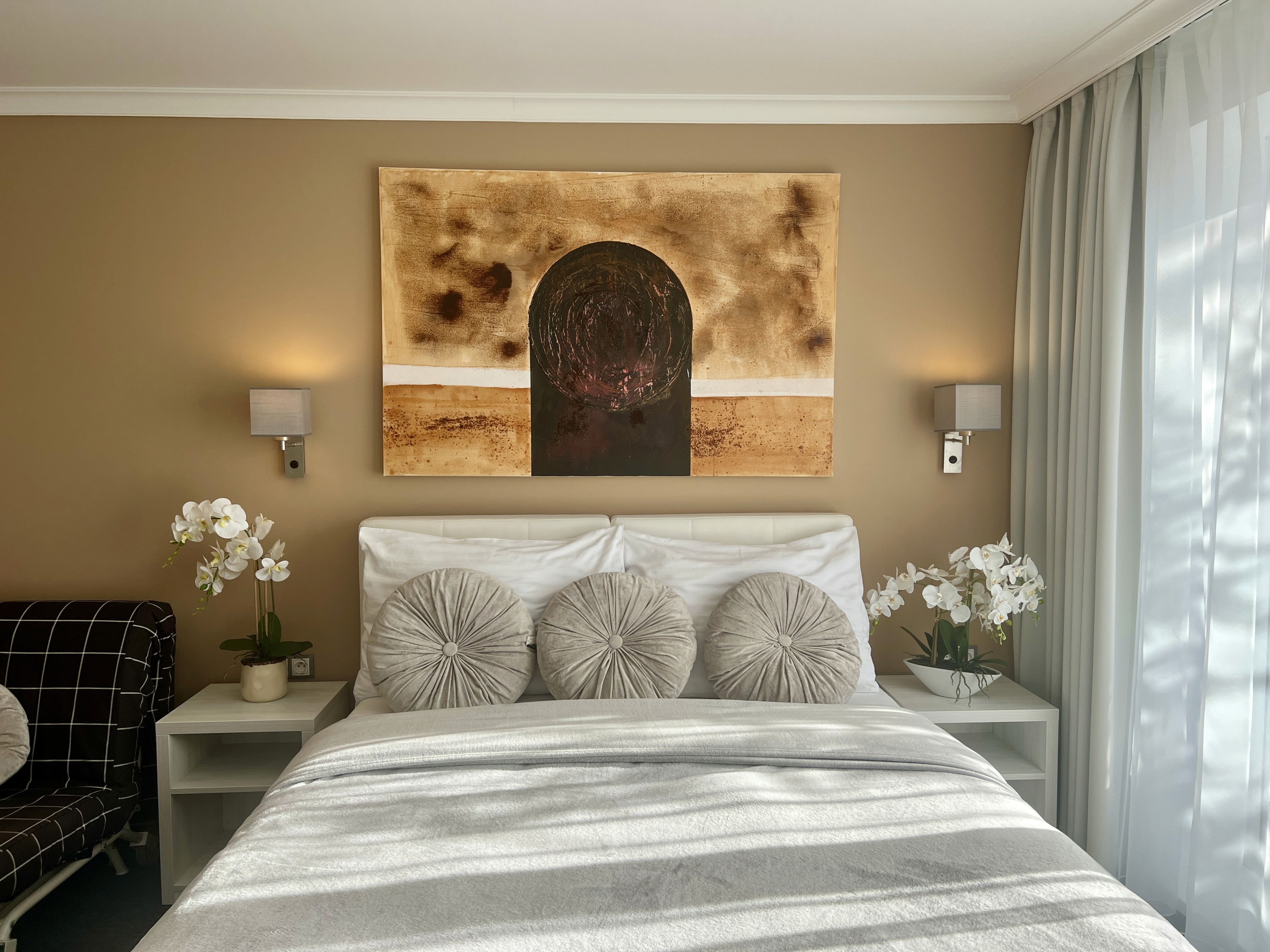 Experience romance in our charming room featuring a private balcony with furniture and lovely views of the garden through panoramic windows. This inviting space includes a double bed and a single bed, along with a bathroom equipped with a shower. Enjoy restful nights on an orthopedic mattress behind thick blackout curtains, ensuring a peaceful sleep. You can also secure your valuables in the safe and enjoy a cup of tea or coffee right in your room—a kettle, cups, sachets, and a coffee machine will be ready for you upon arrival. The room is adorned with crisp white cotton linens, adding an extra touch of comfort and luxury. The room also includes a work desk for those who need to catch up on tasks. Additional amenities include a small refrigerator, hairdryer, and fan. Should you need an iron, extra pillow, or luggage scale, we're happy to provide those as well. If you're arriving by car, you can take advantage of the free public parking lot in front of the hotel. Each morning, indulge in our buffet breakfast served from 7:00 to 10:00 am.